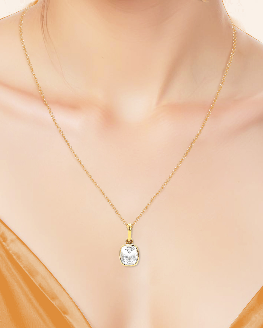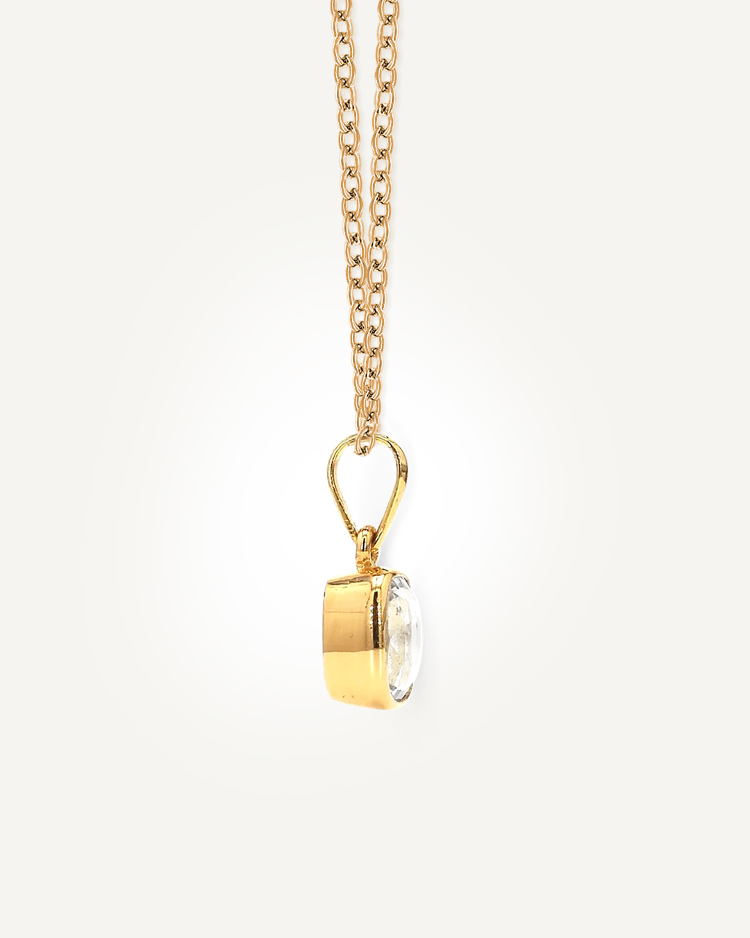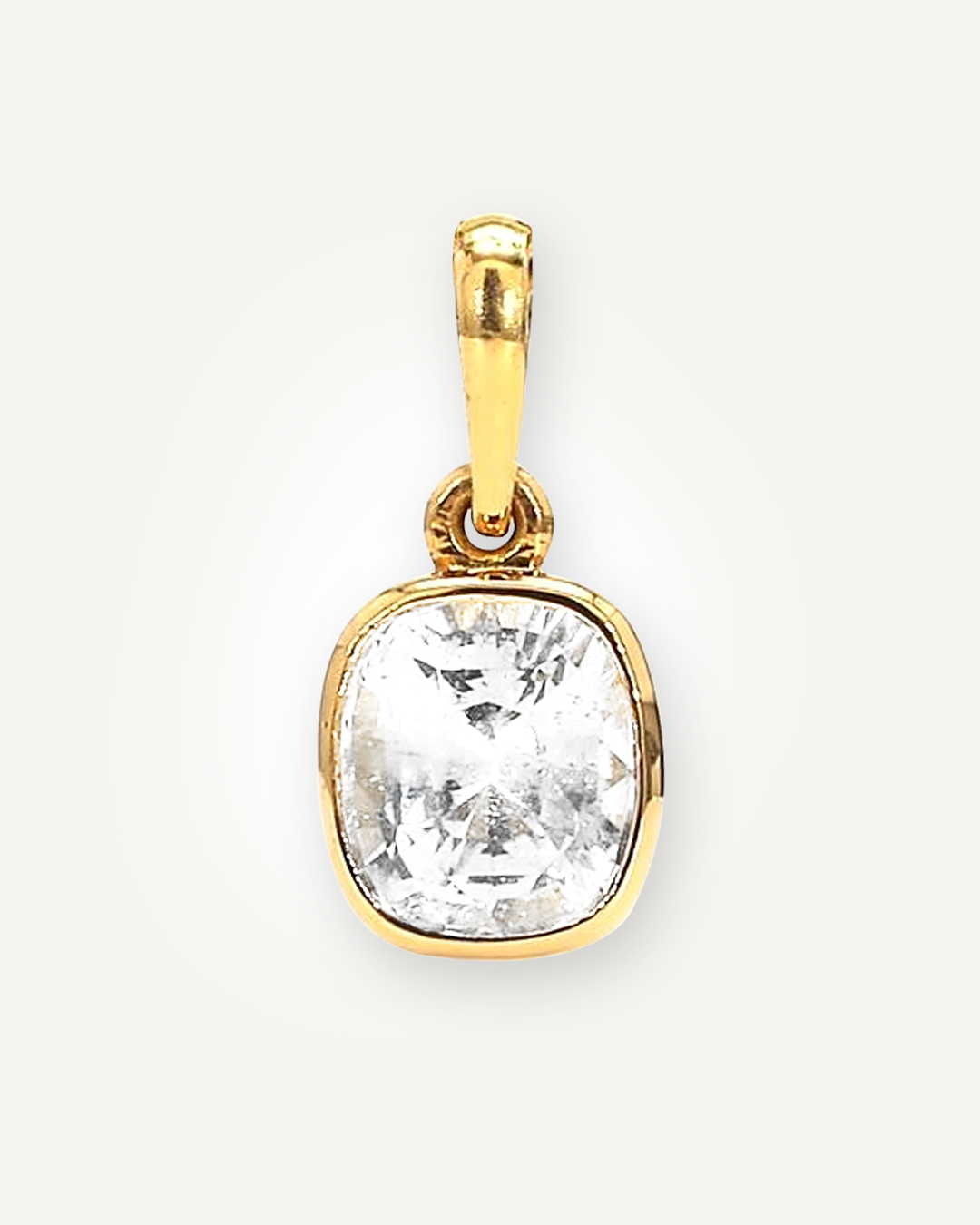 Crafted in 18K gold, the Luna Gleam pendant showcases a brilliant white sapphire in a classic bezel setting, blending elegance with everyday simplicity. The polished gold rim gently frames the gemstone, enhancing its natural sparkle while offering lasting durability. The stone features visible natural blemishes—subtle marks that reflect its authenticity and organic origin. A timeless piece, designed to catch the light—and every eye—with graceful movement.