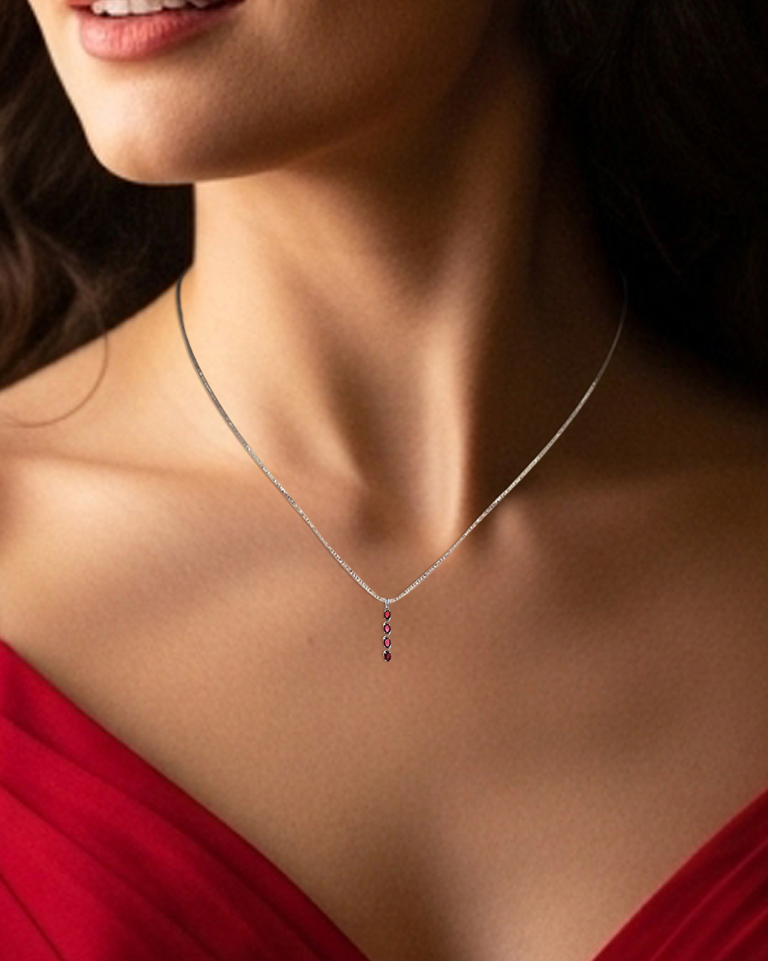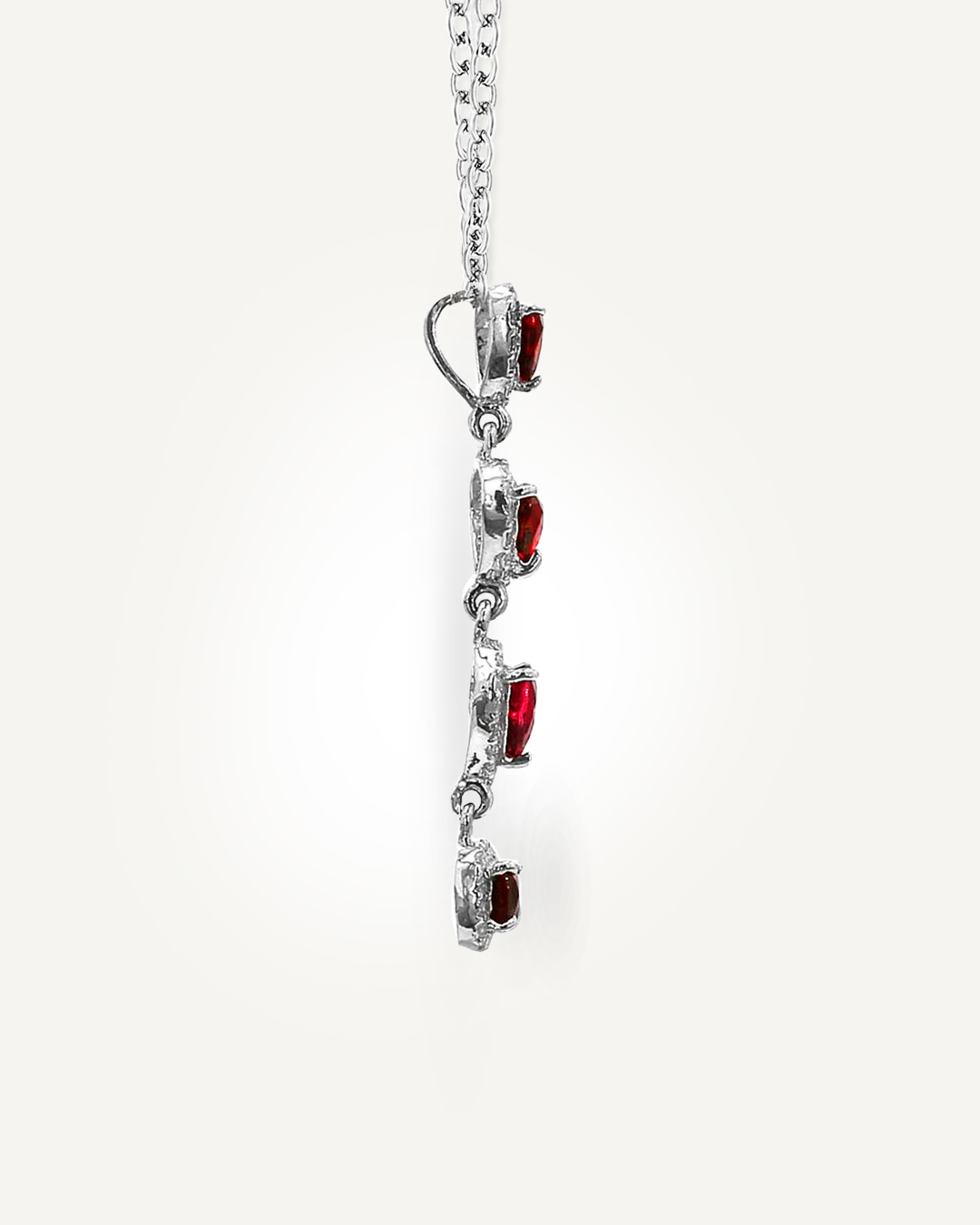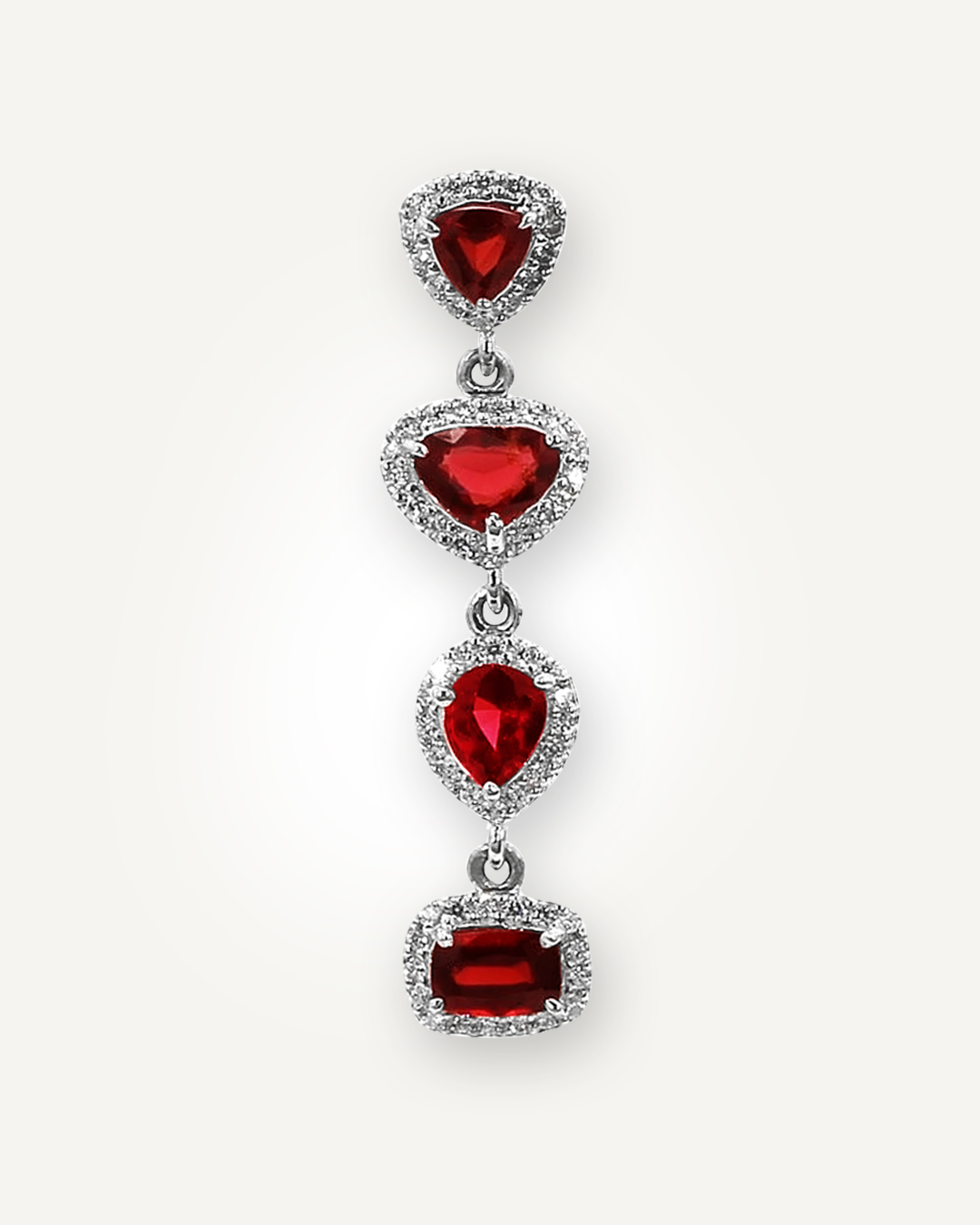 Striking and luxurious, this pendant features a captivating sequence of garnet gemstones in three distinct cuts—cushion, pear, and trillion—each showcasing a deep, rich red hue with exceptional brilliance. Every garnet is framed by a shimmering halo of American Diamonds, adding radiant sparkle and enhancing the depth of the stones.
