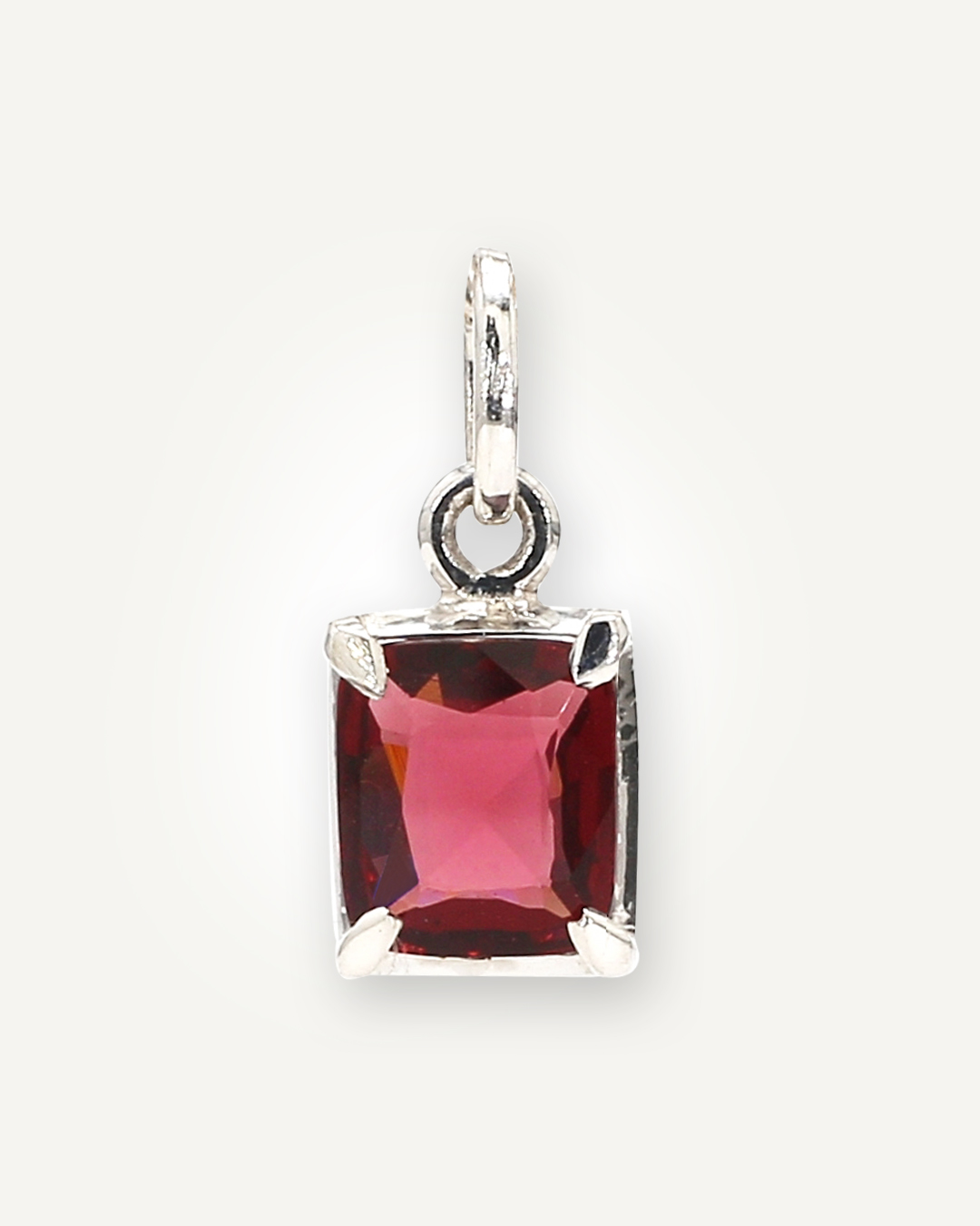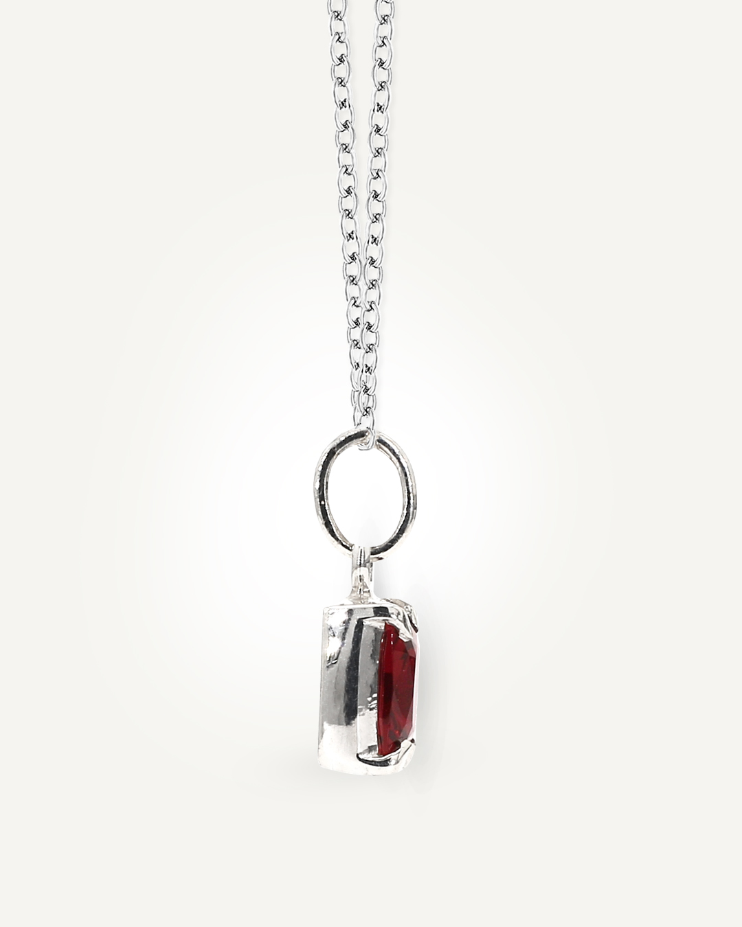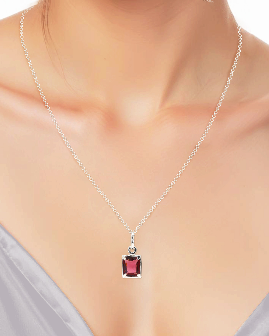 Radiating warmth and elegance, this pendant features a natural red cushion-cut garnet set in 925 sterling silver. The stone’s deep, rich hue reflects its natural beauty, while the sleek silver setting enhances its brilliance. Designed to capture light from every angle, this pendant is a timeless piece that adds a touch of sophistication and charm to any ensemble.