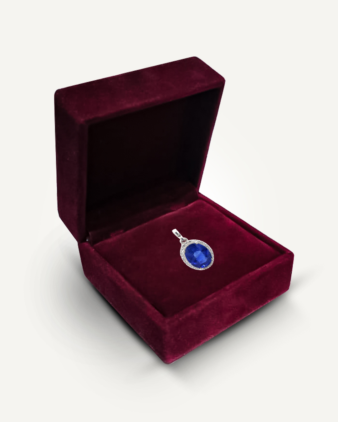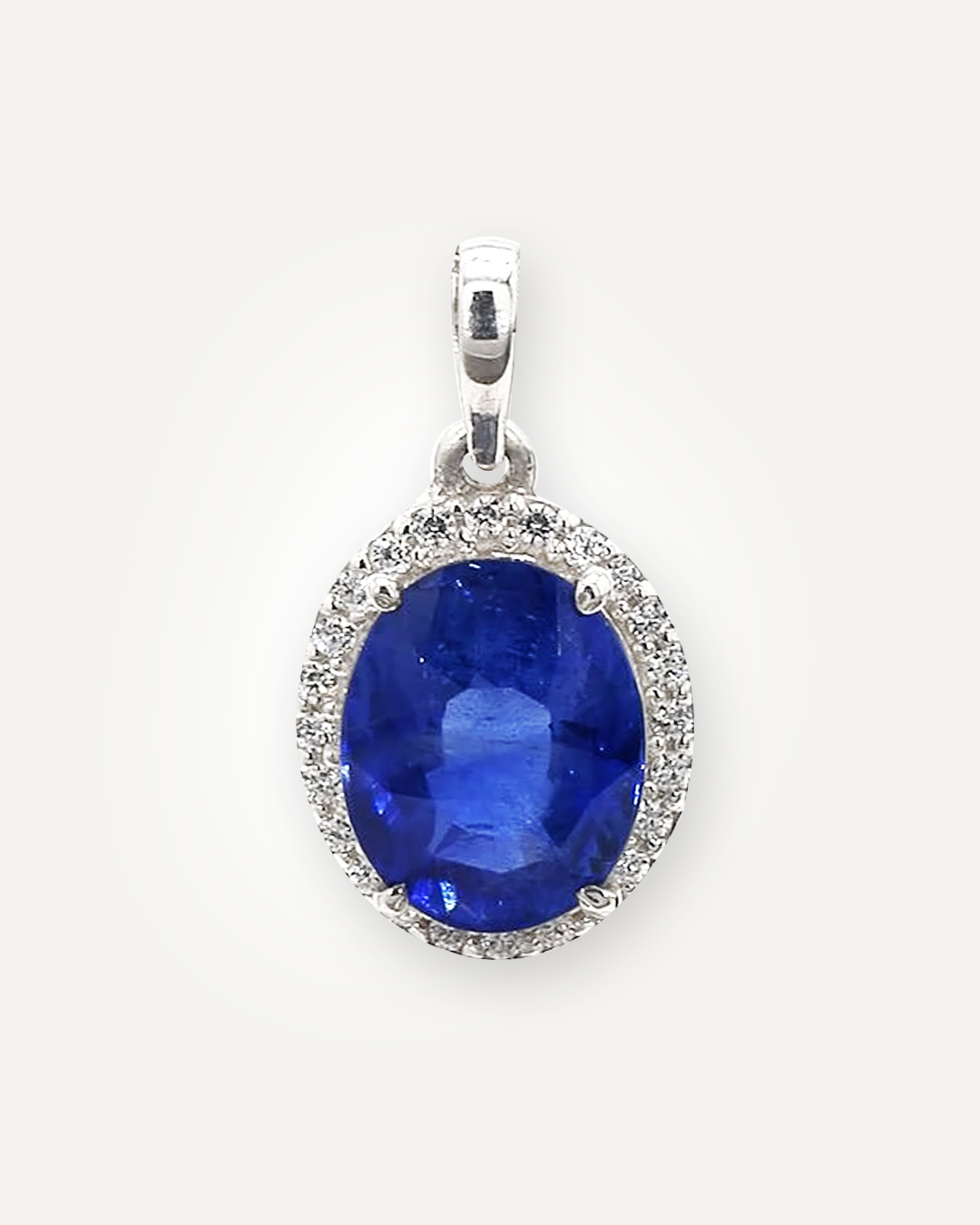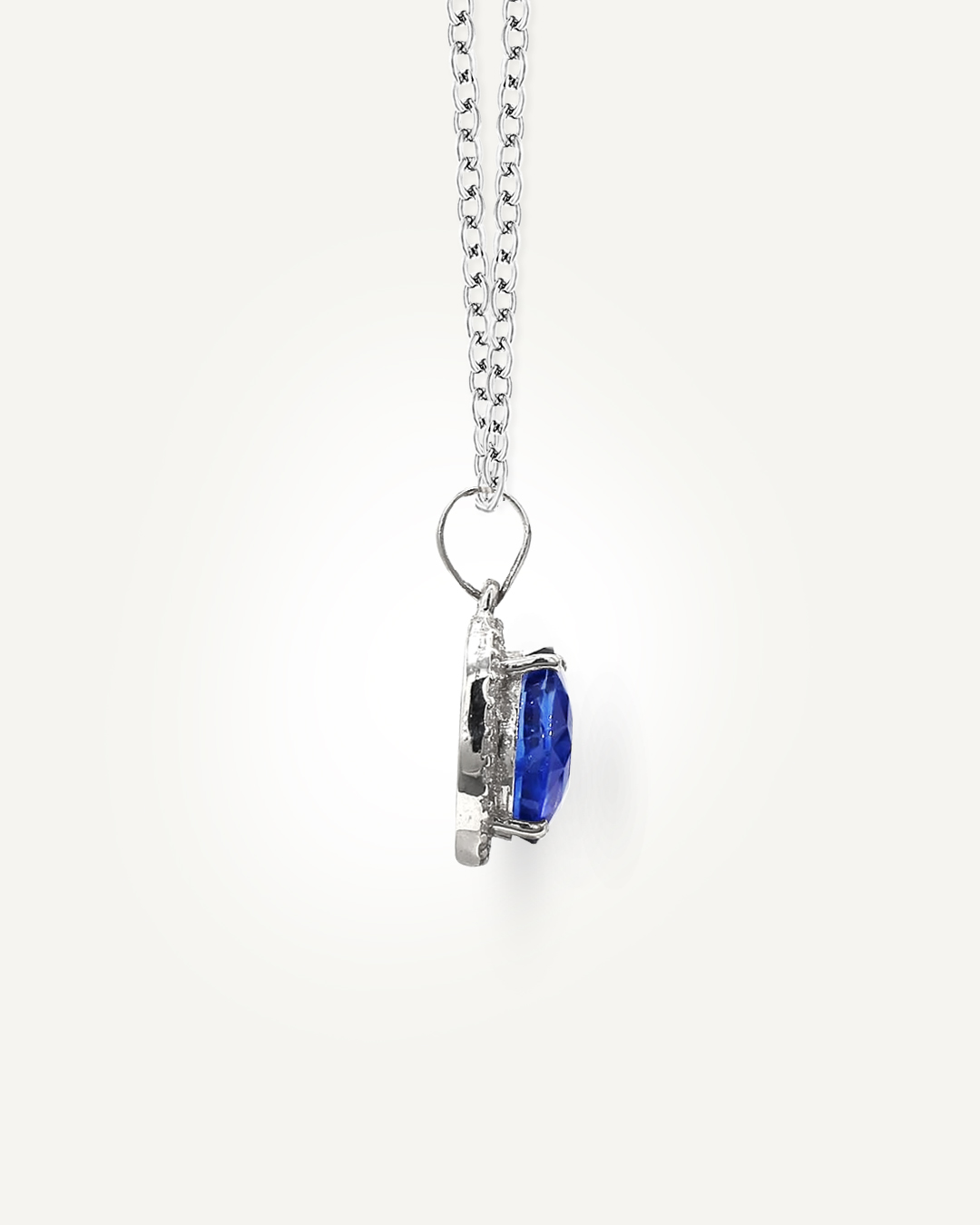 Elegant and timeless, this pendant showcases an oval-cut blue sapphire radiating vivid, deep-blue brilliance. Surrounding the centre stone is a refined halo of 22 sparkling American Diamonds, enhancing its colour with luminous contrast and creating a beautifully balanced design. Crafted in 925 sterling silver, the pendant captures light effortlessly, offering a luxurious yet versatile look suitable for daily wear or special occasions.
