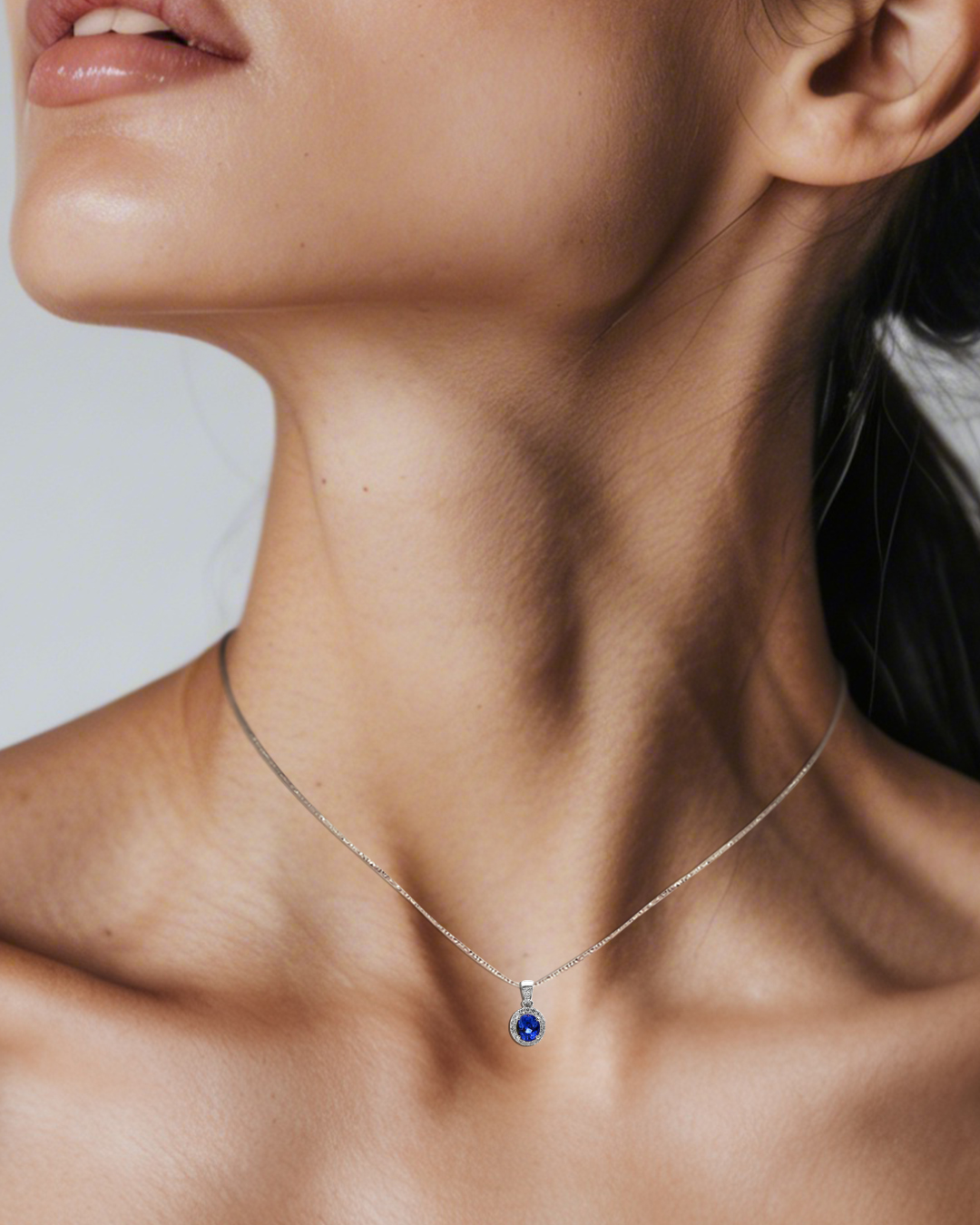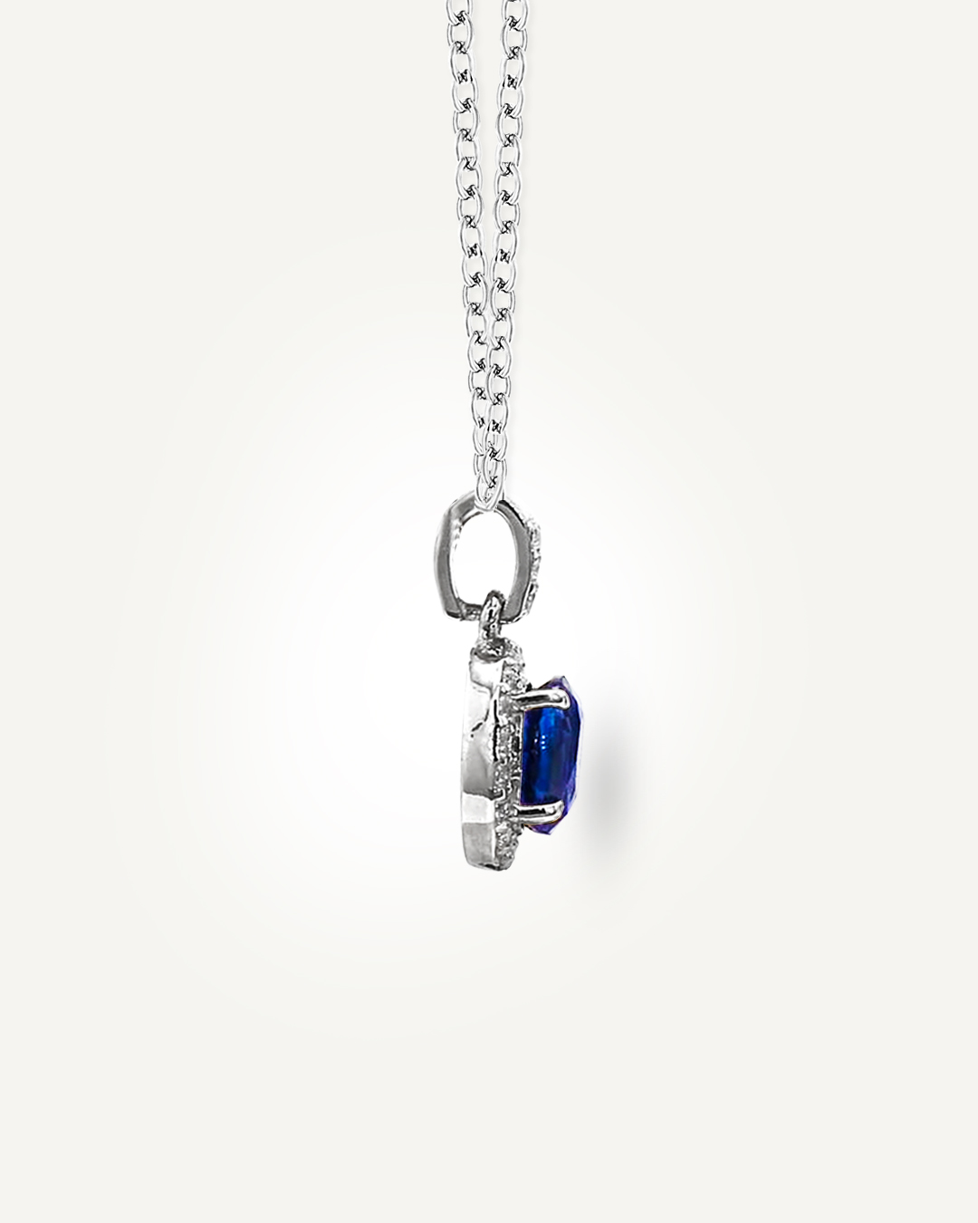 Timeless and striking, this pendant features an oval-cut blue sapphire displaying deep, vivid-blue hues with captivating brilliance. Surrounding the centre stone is a radiant halo of 21 sparkling American Diamonds, including those set along the bail, adding refined shimmer and enhancing the sapphire’s natural vibrance. Crafted in 925 sterling silver, this classic halo design blends luxury with modern elegance, making it ideal for both everyday wear and special occasions.