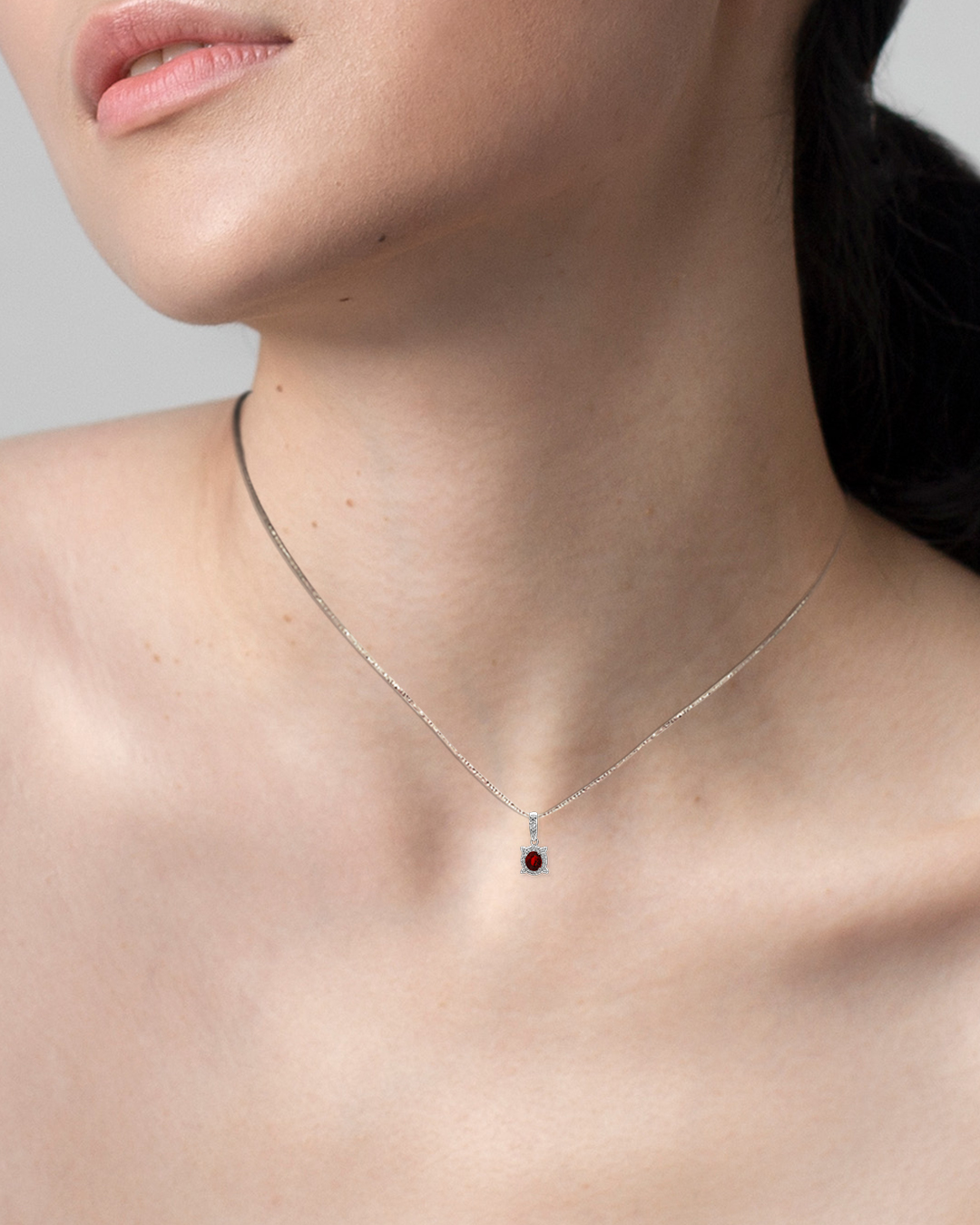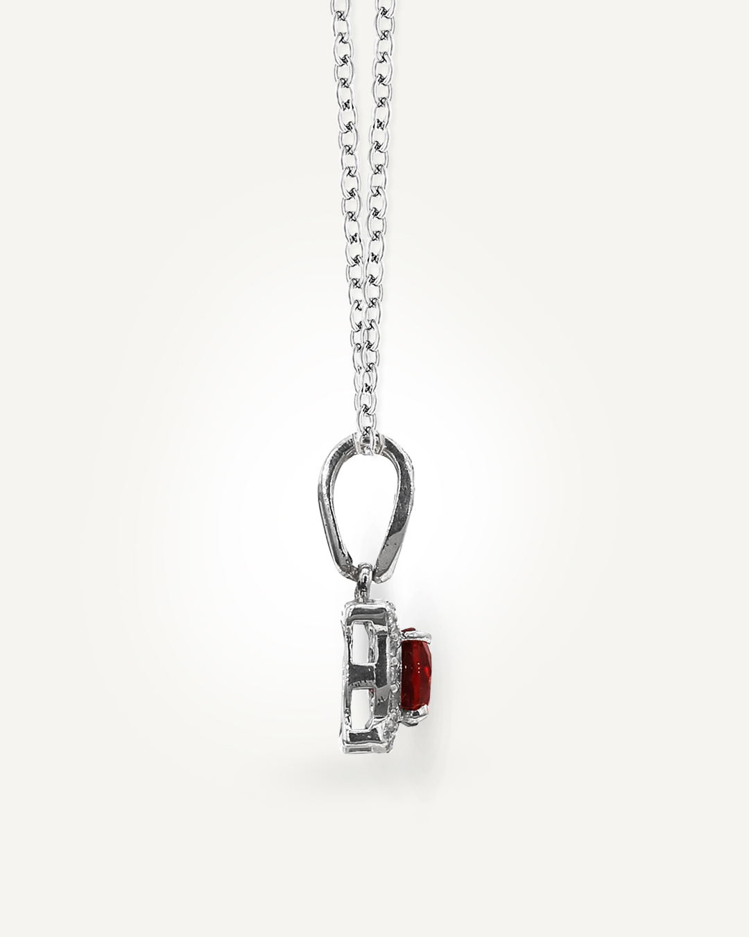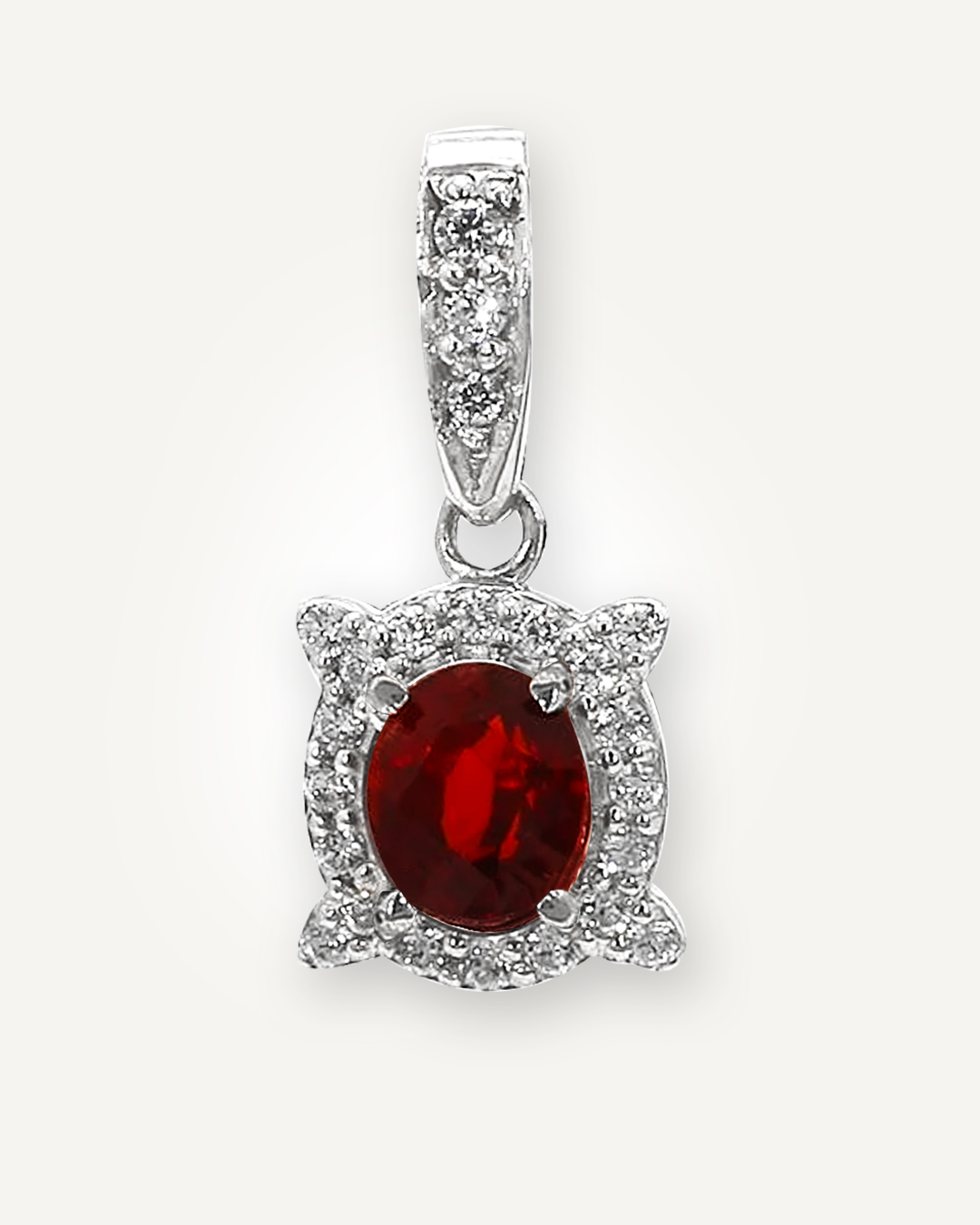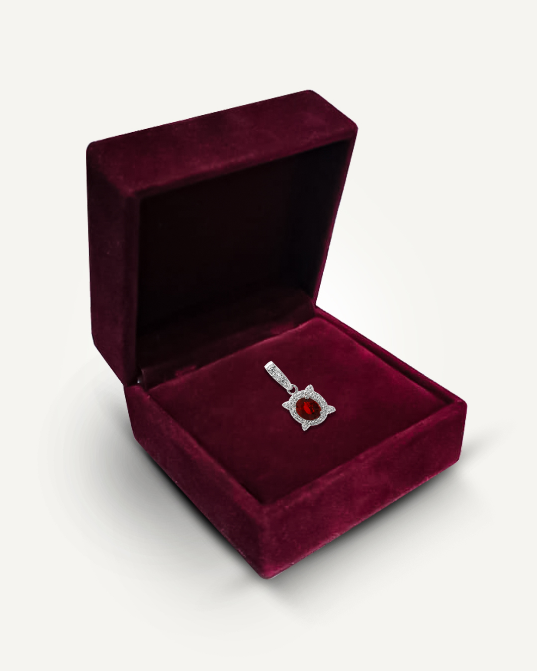 Classic and radiant, this pendant features an oval-cut garnet that displays a deep, fiery red hue with captivating brilliance. Surrounding the centre stone is a shimmering halo of 20 sparkling American Diamonds, arranged in a delicate floral-inspired silhouette that enhances the garnet’s richness from every angle.