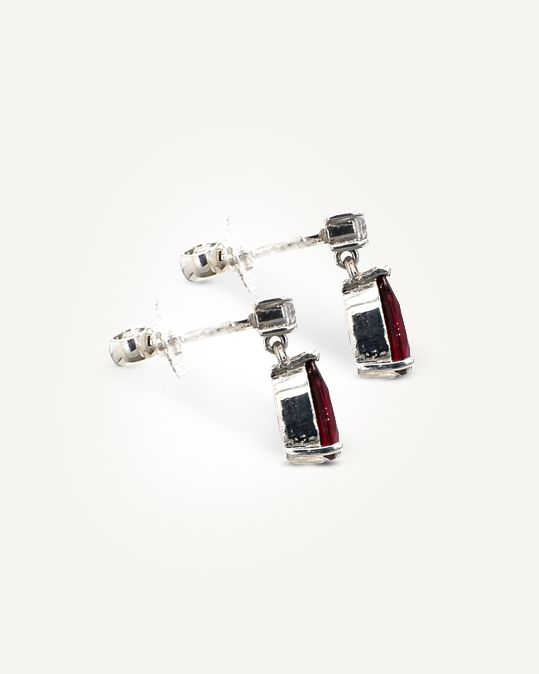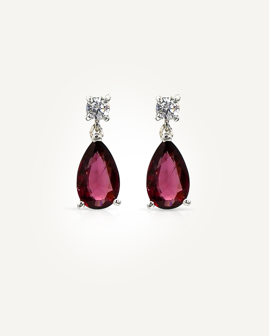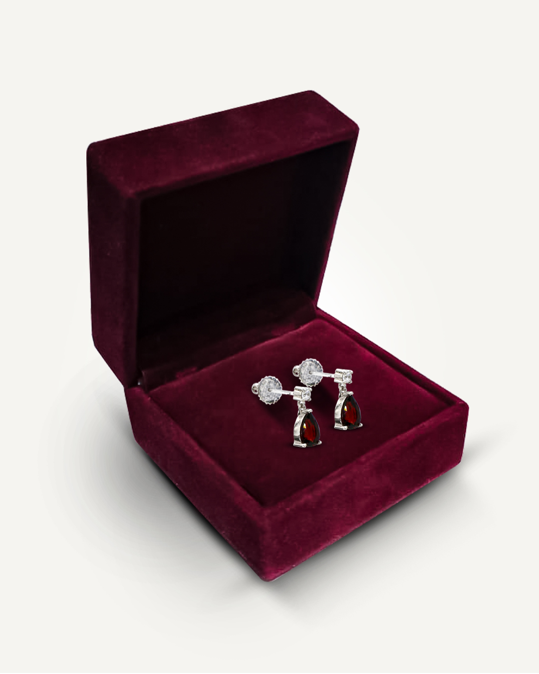 Elegant and eye-catching, these earrings feature pear-cut deep-red garnets that hang gracefully from brilliant American Diamond studs. The vivid colour of the garnets is beautifully complemented by the sparkling American Diamonds above, creating a refined contrast and a touch of luxurious shine. Set in 925 sterling silver, the design offers delicate movement and timeless charm, making these earrings perfect for both everyday sophistication and special occasions.