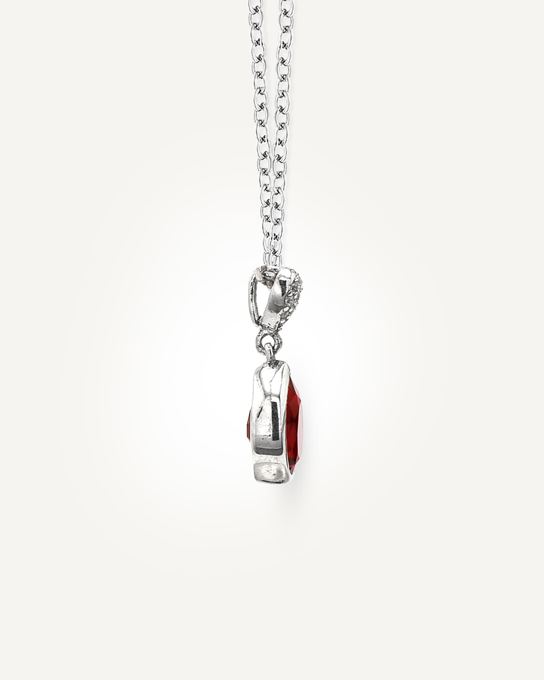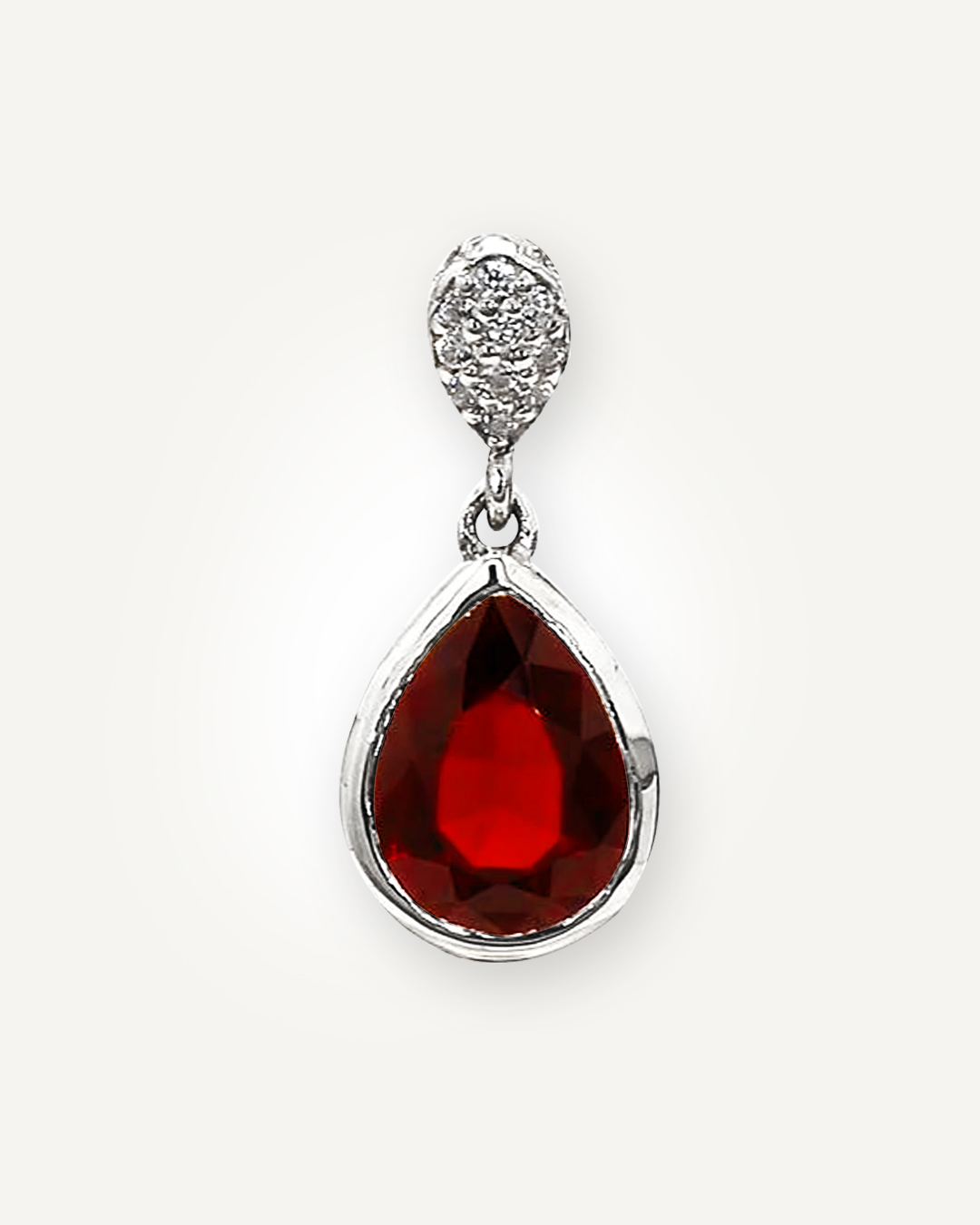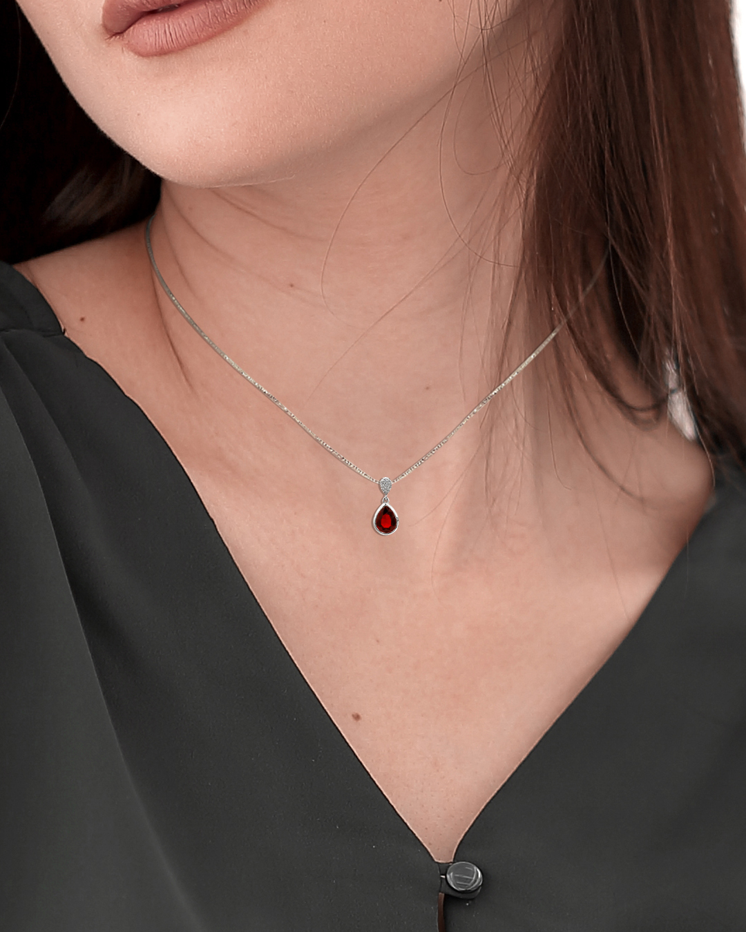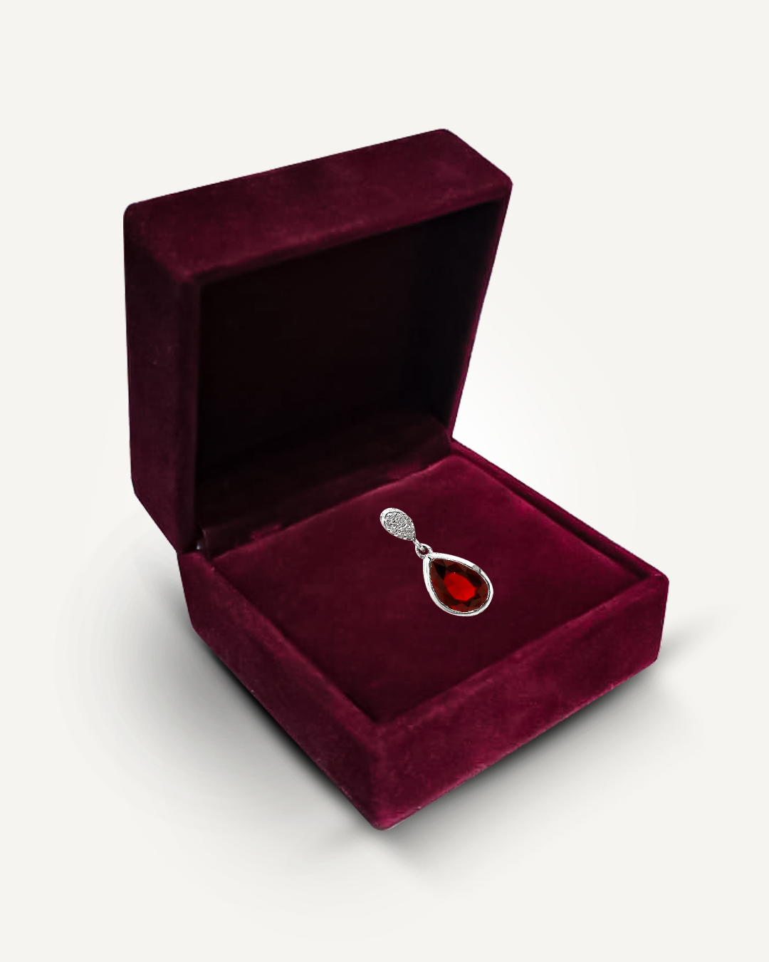 Graceful and refined, this pendant showcases a pear-cut natural garnet suspended from a pavé-set teardrop bail. The garnet’s deep crimson hue brings richness and warmth, beautifully contrasted by the sparkle of American diamonds set into the bail for added brilliance. Crafted in 925 sterling silver, the design blends elegance with modern simplicity, making it the perfect piece for daily sophistication or special evening wear.