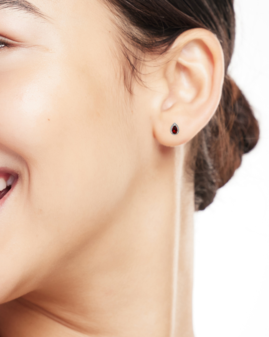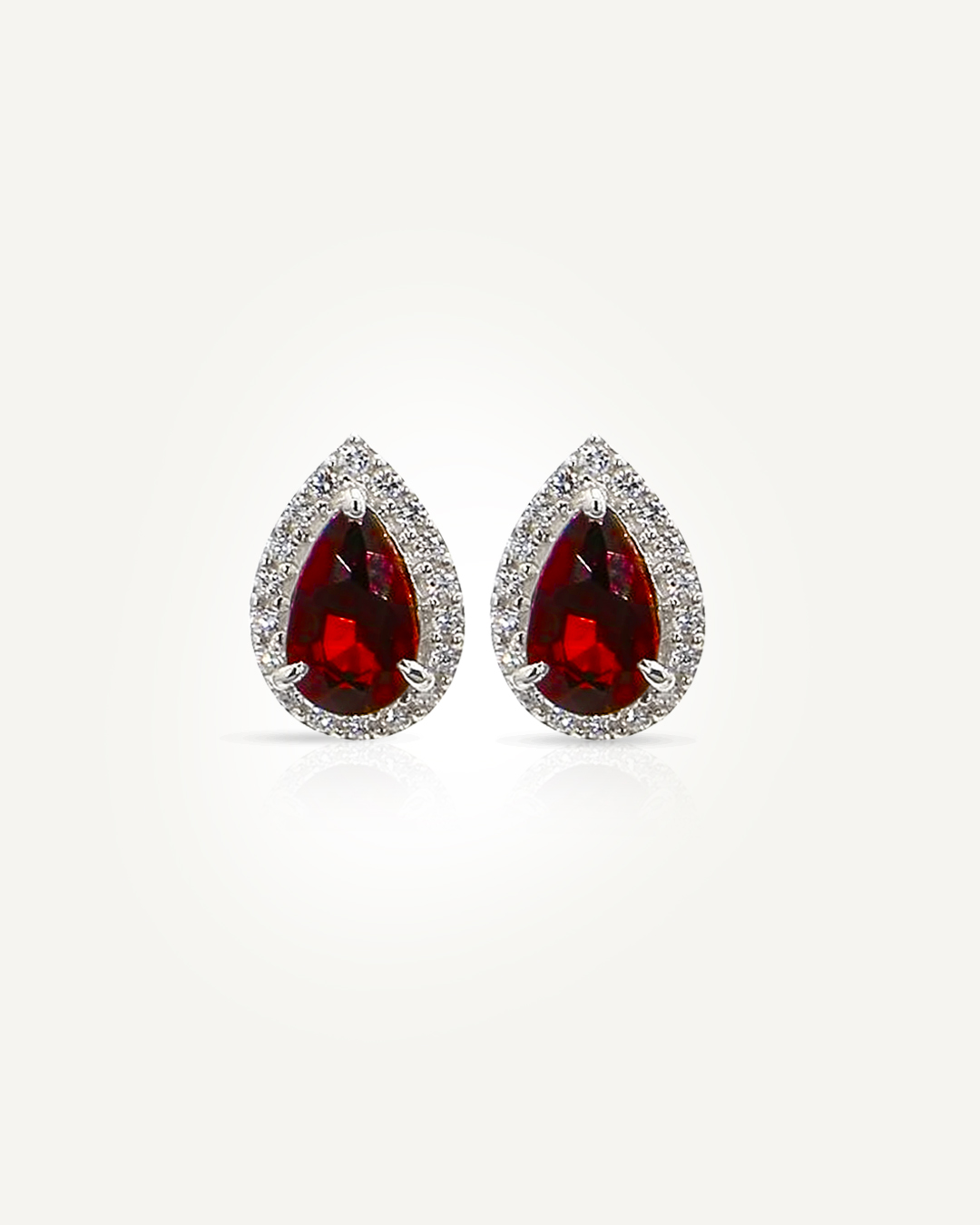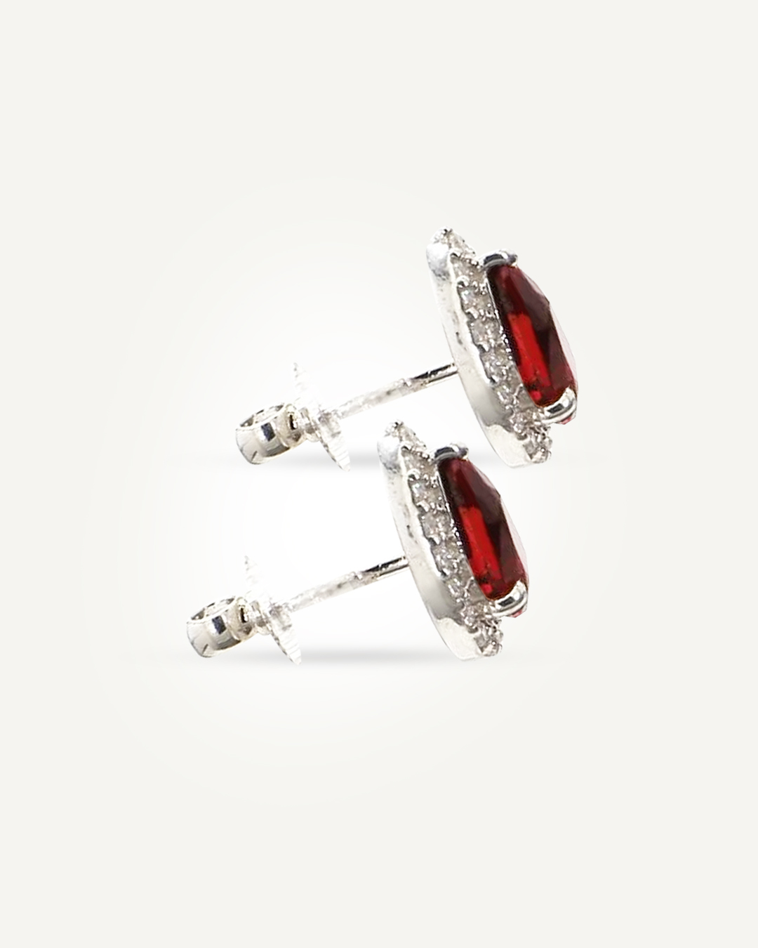 Elegant and radiant, these earrings feature pear-drop natural garnets framed by 16 sparkling American diamonds on each piece. The deep red hue of the garnets exudes timeless sophistication, while the brilliance of the American diamonds enhances their captivating allure. Set in sleek 925 sterling silver, these earrings are designed to catch the light beautifully, making them a perfect choice for adding refined glamour to both everyday wear and special occasions.