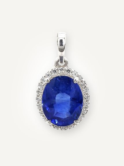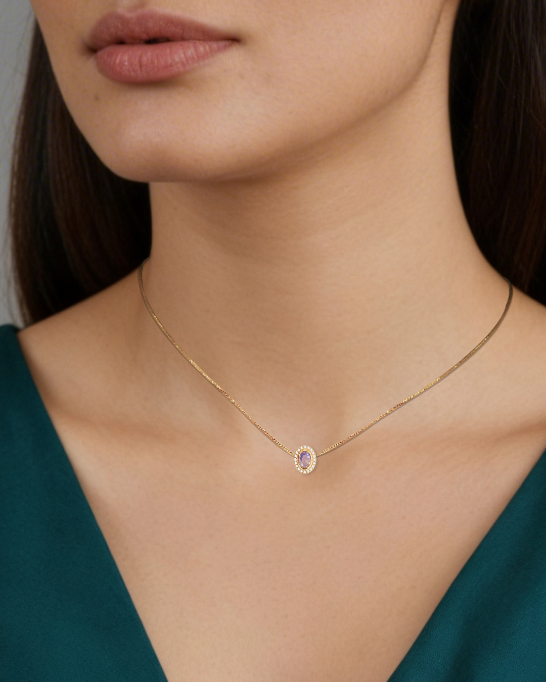 The Celeste Halo pendant features a stunning oval-cut sapphire set in radiant 18K gold, surrounded by shimmering American diamonds. The sapphire displays visible natural blemishes—unique inclusions that affirm its authentic origin and natural beauty. This exquisite design highlights the stone’s deep, vibrant hues while the surrounding stones add a refined sparkle. A timeless and elegant piece, perfect for adding a touch of celestial brilliance to any occasion.