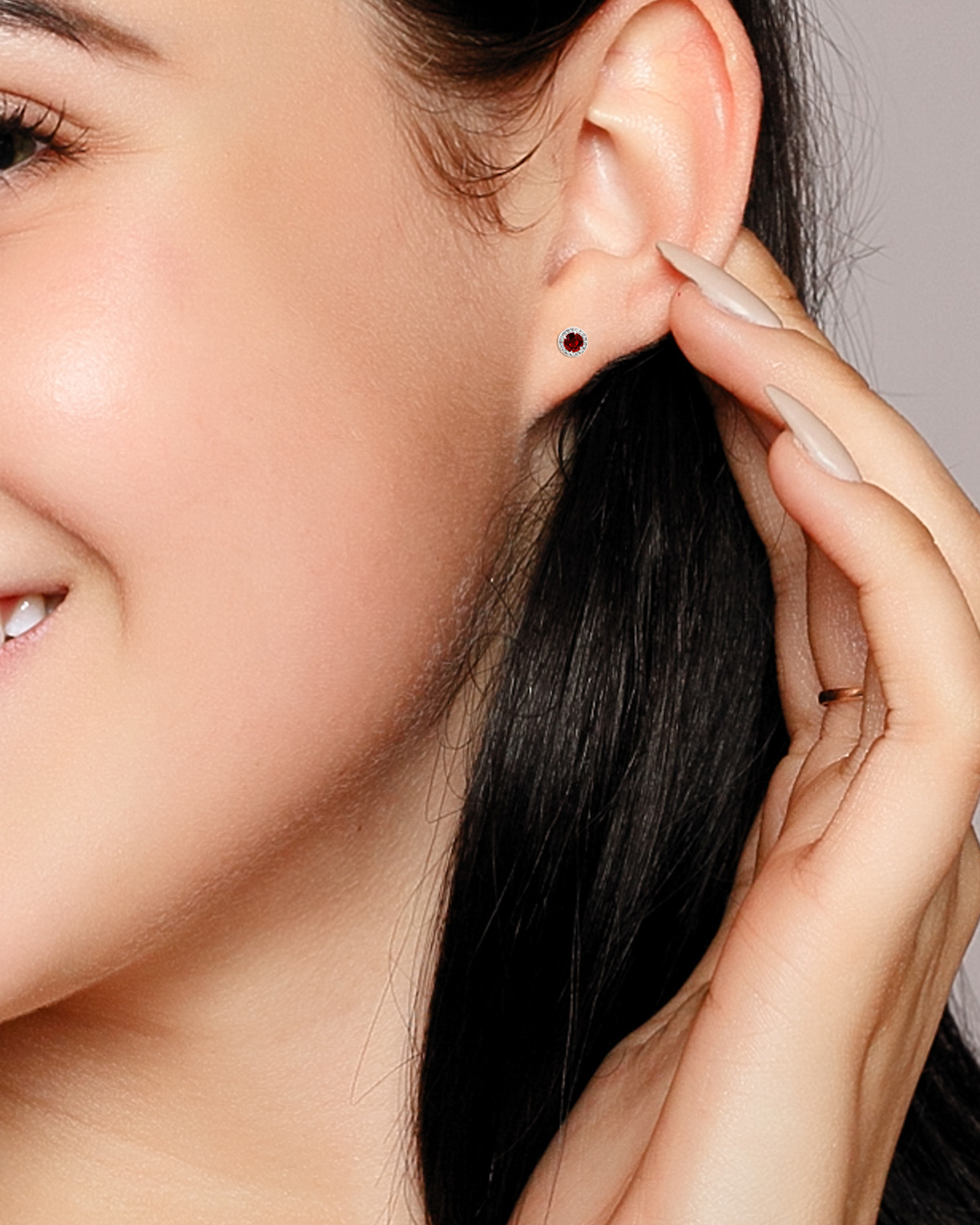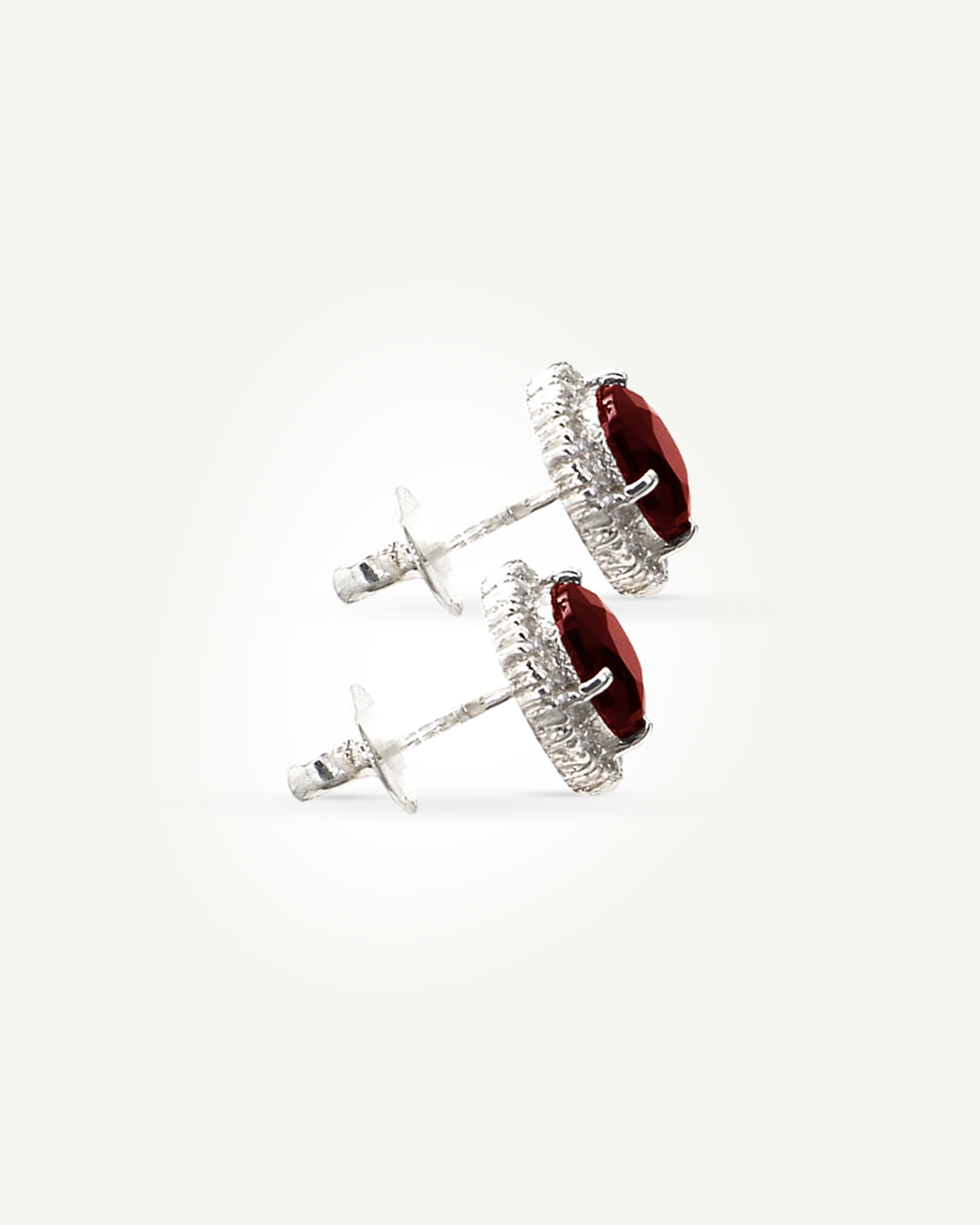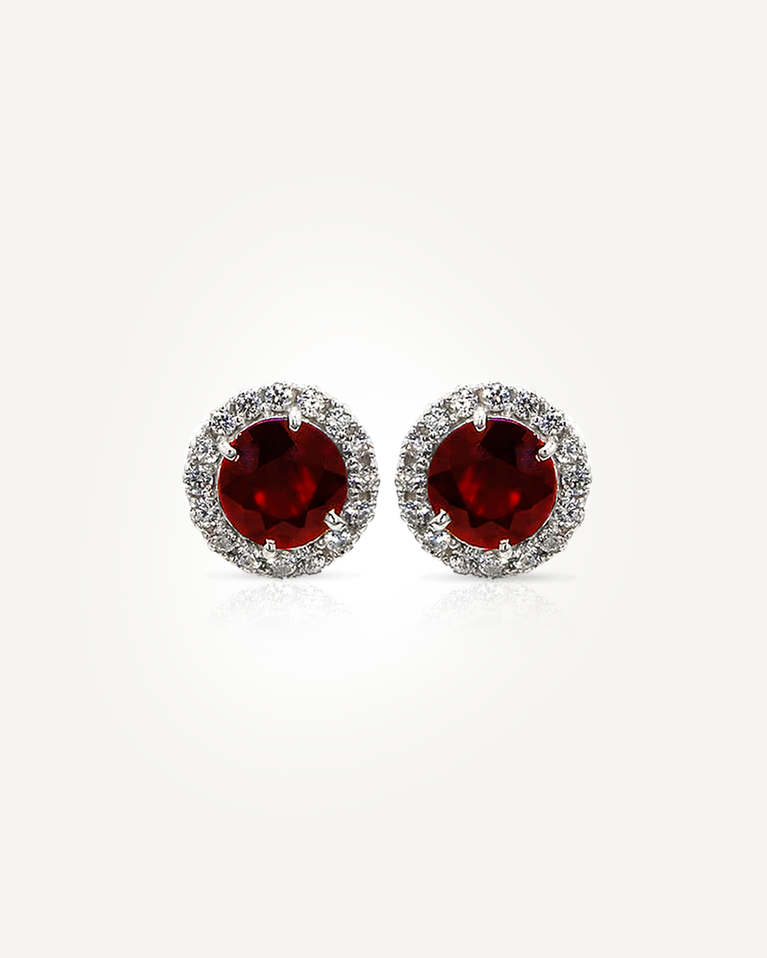 Radiant and timeless, these earrings feature round-cut natural garnets encircled by 16 sparkling American diamonds on each piece. The deep red brilliance of the garnets contrasts beautifully with the shimmering American Diamonds, creating a classic halo design that captures light from every angle. Set in 925 sterling silver, these earrings combine elegance and versatility—perfect for both everyday wear and special occasions.