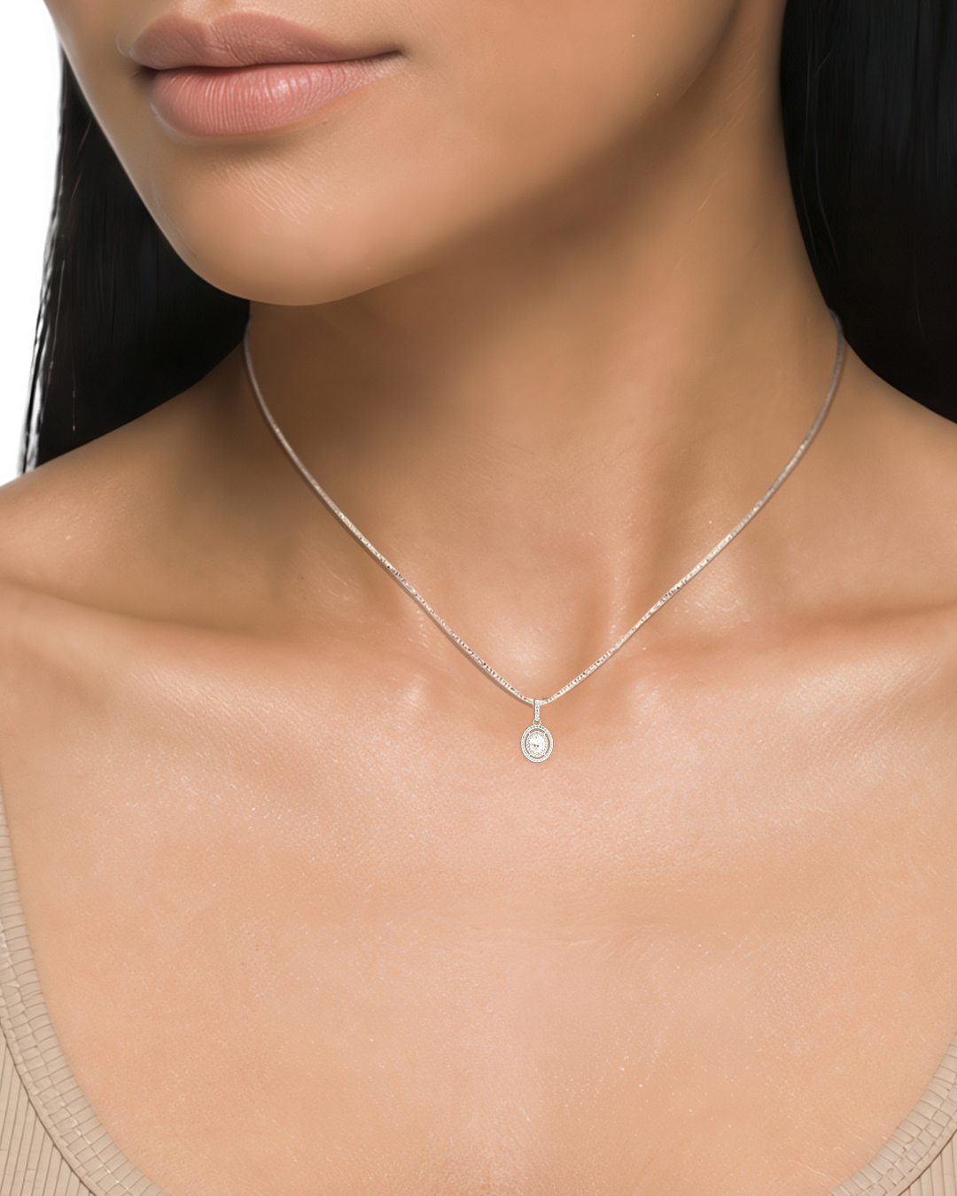 Radiating sophistication and brilliance, this pendant features a stunning oval-cut Sri Lankan white sapphire at its center, showcasing clarity and natural elegance. Surrounding the sapphire are 61 sparkling round-cut American diamonds, meticulously set to create a dazzling halo effect that captures light from every angle. Crafted in sterling silver, this pendant blends timeless charm with modern sparkle, making it a statement piece that enhances any ensemble.