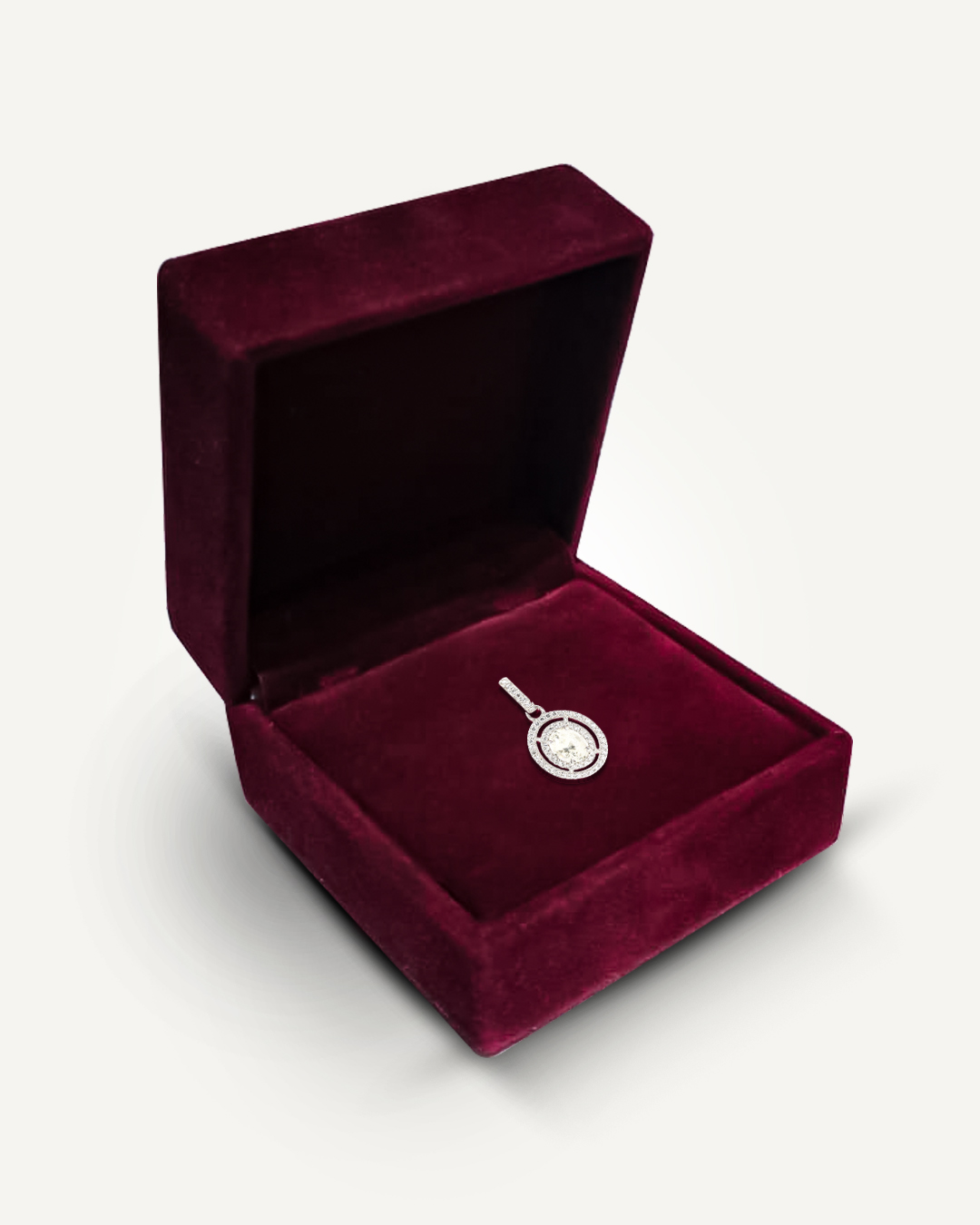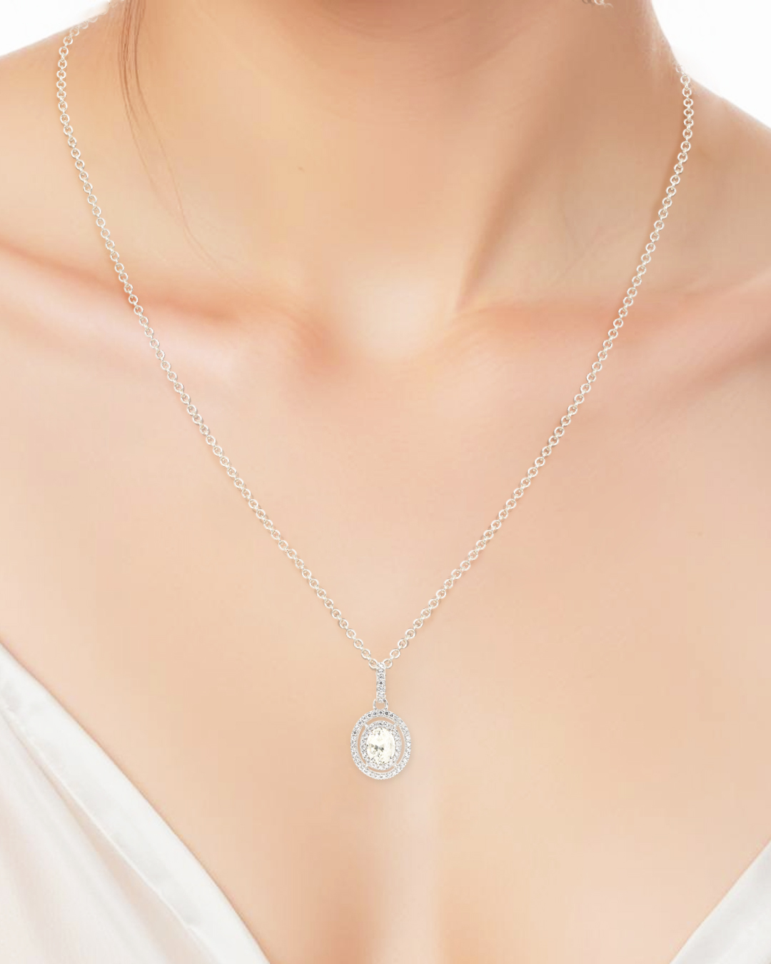 Radiating sophistication and brilliance, this pendant features a stunning oval-cut Sri Lankan white sapphire at its center, showcasing clarity and natural elegance. Surrounding the sapphire are 61 sparkling round-cut American diamonds, meticulously set to create a dazzling halo effect that captures light from every angle. Crafted in sterling silver, this pendant blends timeless charm with modern sparkle, making it a statement piece that enhances any ensemble.